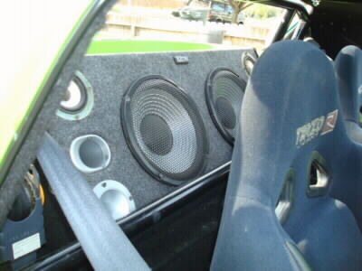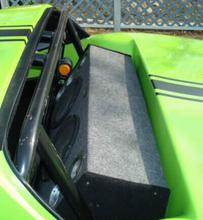 I now have the stereo completely installed. The amplification is modest at 200 watts, but as you can see in the second and third pictures below, I have a rather sizable speaker box which produces good solid bass. The first picture shows the stereo in the traditional console location. If you look on the left side panel you can see the 5.5" front speaker box. I had to create a surface mount box because the way I routed my heater ducts interferred with nearly any possible recessed mounting location. The speakers are small and though rated down to 38hz, don't produce lows with much volume, but what I mainly needed was highs anyway as the rear box does fine with the lows. You can also see the ceiling mounted map lights at the center section in this picture.