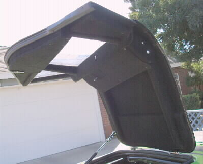The doors are in two pieces so I have three options; no doors, tops only and a complete enclosure for the winter months. Following are pictures of the tee-tops and the complete doors. While the final product does the job (I can even use a hose to wash the car now), I can't say I'm completely happy with the fit and finish. I used wrinkle finish paint to match the rear window cowl, which did not wrinkle consistently, but plan to ultimately cover everything with real vinyl. The gasket/weatherseals are a bit too large and the passinger side does not fit as well as I'd like. Though I toyed with several ideas for latching (selinoid, bear claw, etc.), I am currently just using simple slide bolts.