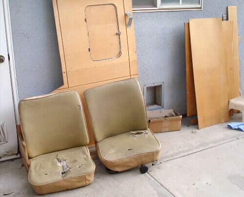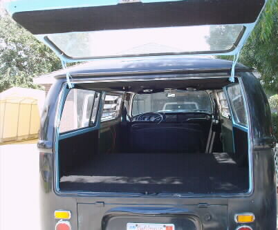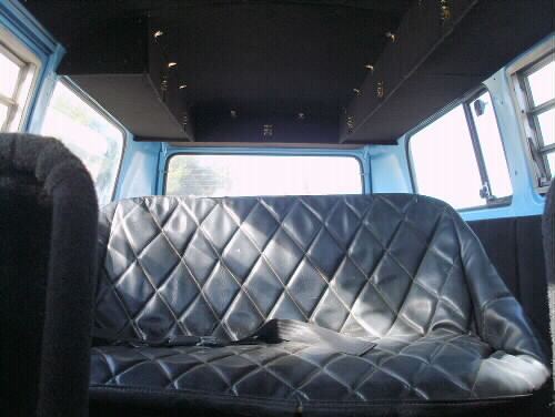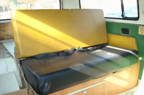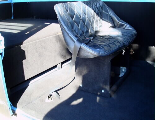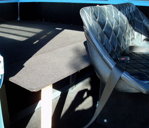 The above pictures show the middle section of the bus with the rear pedestal seat and the folding extension that provides a full double bed sized platform. Ultimately, I will construct a camping module that will interchange with the rear seat module shown.