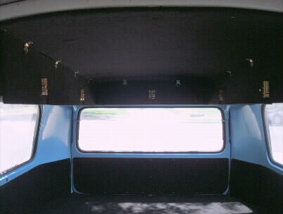 The first picture above shows the rear area as seen from the cab. You can see the rear seat and the upper cabinets. The second picture above shows the cab again after it has been repainted to match the blue that will be on at least part of the exterior.