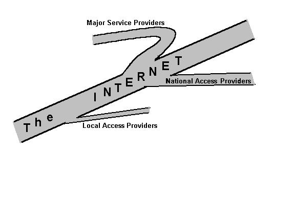 A. Access to the Information Super Highway is generally from one of three sources B. Source I: Service Providers 1. These are the ones familiar to most everyone 2. Examples a. American On-Line (AOL) b. CompuServe c. Prodigy d. Genie? 3. Advantages a. Very easy to install software, readily available b. Offer some services not YET available on the net c. Fairly easy to navigate d. Often better technical support 4. Disadvantages a. Usually charge by the hour b. Long distance call in some areas (like Kings County) c. Often still running at 9600 bps d. Sometimes difficult to find the highway on-ramp among all the rest of the features e. No local technical support person 5. Analogy - Big city with freeway running through it a. Lots to do without leaving town b. Freeway is there when you need it C. Source II: National Access Providers 1. These are just now appearing 2. Examples a. IDT Internet ($ 15.95/month) b. AT&T or Local Telco ($ 19.95/month) 3. Advantages a. Software somewhat easier to install than local providers b. May have backing of major company c. In the case of phone companies, dealing with 1 company instead of up to 3 4. Disadvantages a. May be long distance call b. May be 800 call, high user to modem ratio c. No local technical support d. Not always equipped to meet growing needs, not many options for business use 5. Analogy - Rural residence next to freeway a. Not much to offer except the internet b. No local repair shops D. Source III: Local Access Providers 1. Have not been around as long as service providers, but, longer than national providers 2. Examples a. Vary in each community b. In Kings County * kcsnet.com * CNEtechnet * Kings Internet 3. Advantages a. Fixed low monthly rates b. Always a local call c. Local technical support, may even provide home installation for a small fee d. Often has very current equipment & low user/modem ratio e. May offer local education classes f. Most often willing to provide what ever level of service is needed 4. Disadvantages a. Often provides mix-matched shareware type software b. Often more work to configure software c. Local tech support may not be as knowledgable d. Service only as good as character of local provider 5. Analogy - Small town by freeway a. Some local services b. Neighbors to help